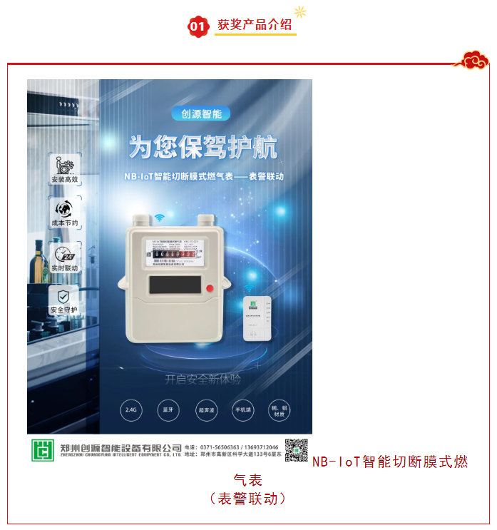 本次獲獎的NB-IoT智能切斷膜式燃氣表(表警聯動)產品由我司自主研發,已取得發明專利。該產品主要有實時監控、聲光報警、自動關閥、自由配對、遠程閥控、報警信息實時推送等功能,為居民及工商業燃氣安全運營保駕護航。